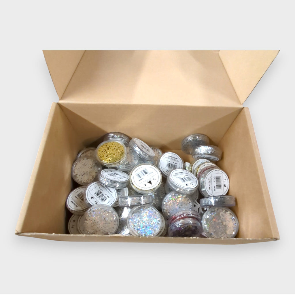 42x Basteldosen mit glitter, verschiedene Ausführen (recherchierter Verkaufspreis ca. 3,99 € / Stück).