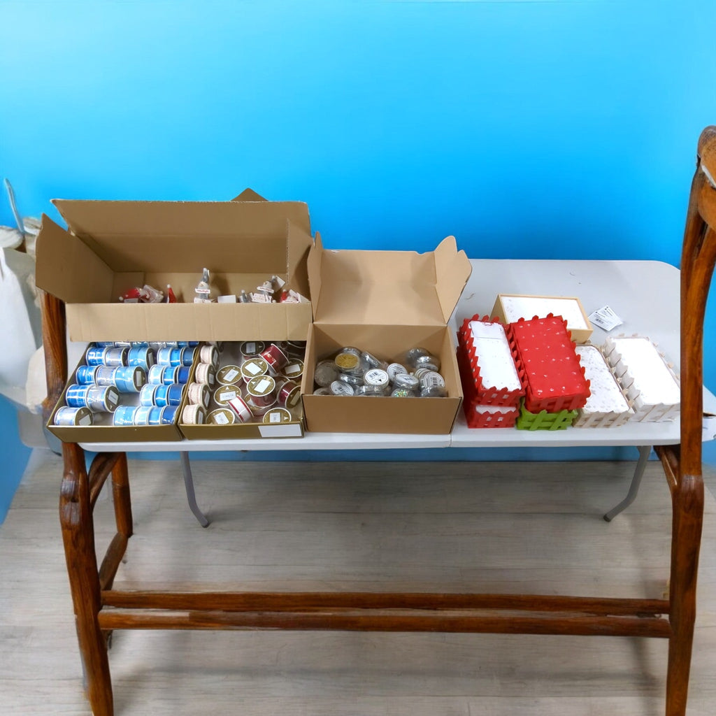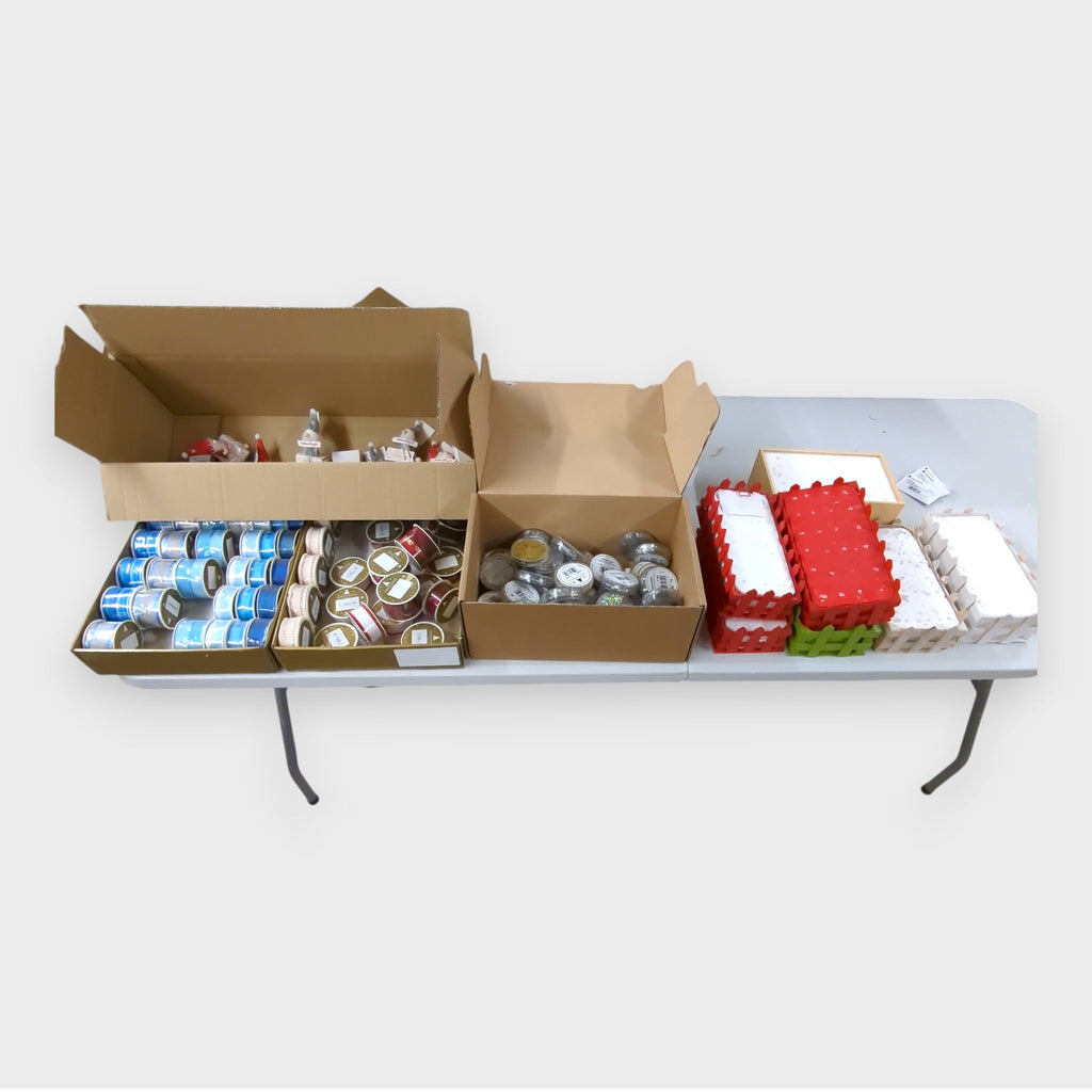 Wir bieten einen Restposten aus Geschenkbändern, Bastelglitter und Weihnachtsdekoration mit folgenden Stückzahlen an (ca.)