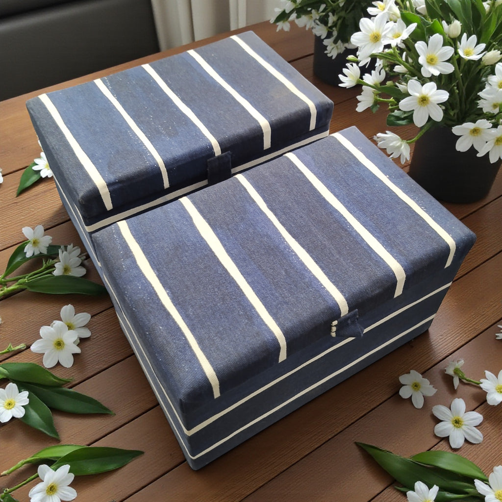 Du suchst eine stilvolle und nachhaltige Lösung, um Ordnung in deinem Zuhause zu schaffen? Die Ikea INNEHÅLLSRIK Aufbewahrungsdose bringt mit ihrem handgefertigten, blau-weiß gestreiften Design nicht nur Struktur, sondern auch einen Hauch von maritimem Flair in dein Leben. Ob Schmuck, Briefe oder kleine Schätze – hier findet alles seinen Platz. Mit jedem Kauf unterstützt du soziale Projekte in Indien und förderst faire Arbeitsbedingungen.