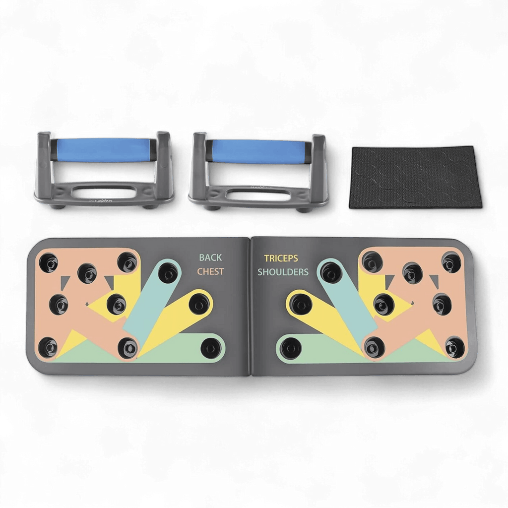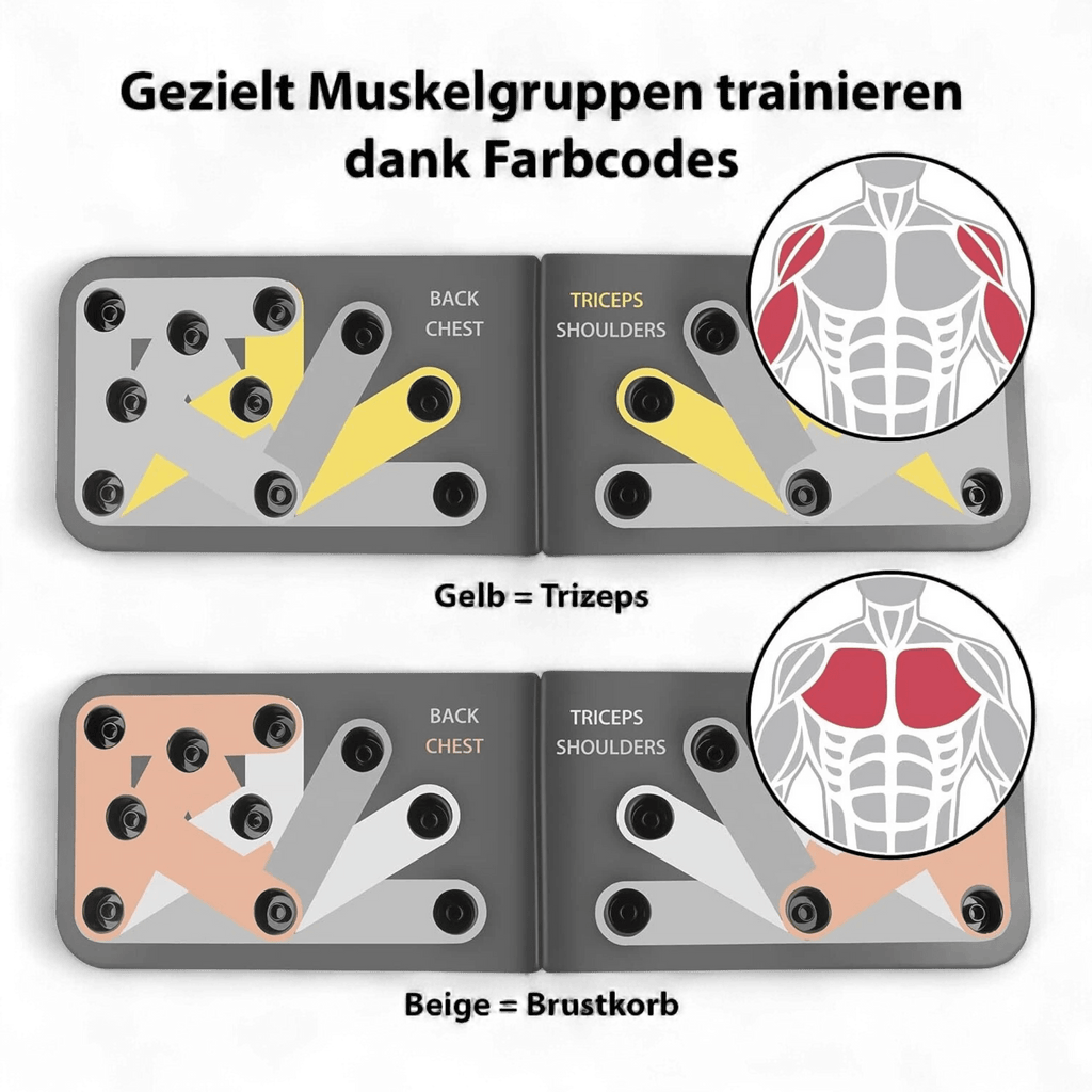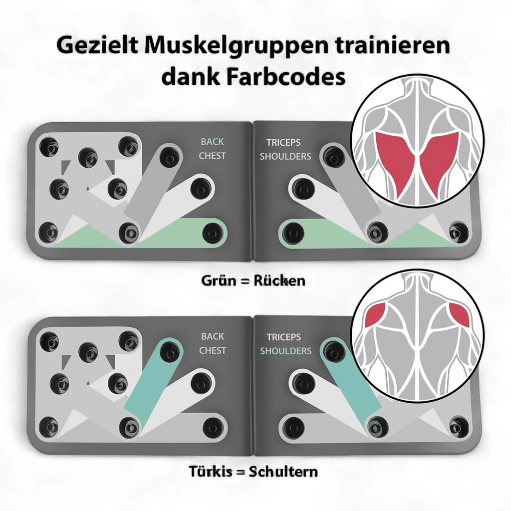 Bring dein Training auf das nächste Level – mit dem Maxxmee Push Up Board! Das klappbare Brett mit cleveren Farbcodes und ergonomischen Handgriffen macht es dir leicht, gezielt Brust, Trizeps, Rücken oder Schultern zu trainieren. Die rutschfesten Gummipads sorgen für sicheren Halt auf jedem Untergrund, während die gelenkschonende Bauweise deine Handgelenke schützt.